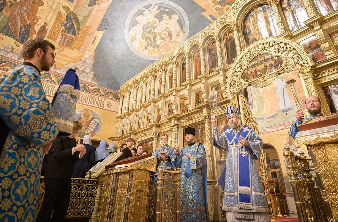 Вечером 13 октября, накануне престольного дня, праздничное всенощное бдение в Покровском академическом храме возглавил митрополит Воронежский и Лискинский Леонтий в сослужении ректора Московской духовной академии епископа Сергиево-Посадского и Дмитровского Кирилла, епископа Скопинского и Шацкого Питирима, ректора Санкт-Петербургской духовной академии епископа Петергофского Силуана, викария Патриаршего экзархата Африки епископа Луховицкого Евфимия, викария Хабаровской епархии, ректора Хабаровской духовной семинарии епископа Бикинского Пантелеимона, ректора Николо-Угрешской духовной семинарии иеромонаха Луки (Пронских), духовенства Московской духовной академии и гостей в священном сане.