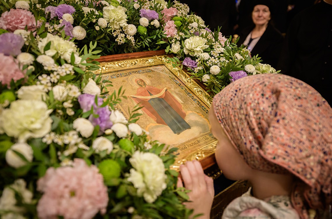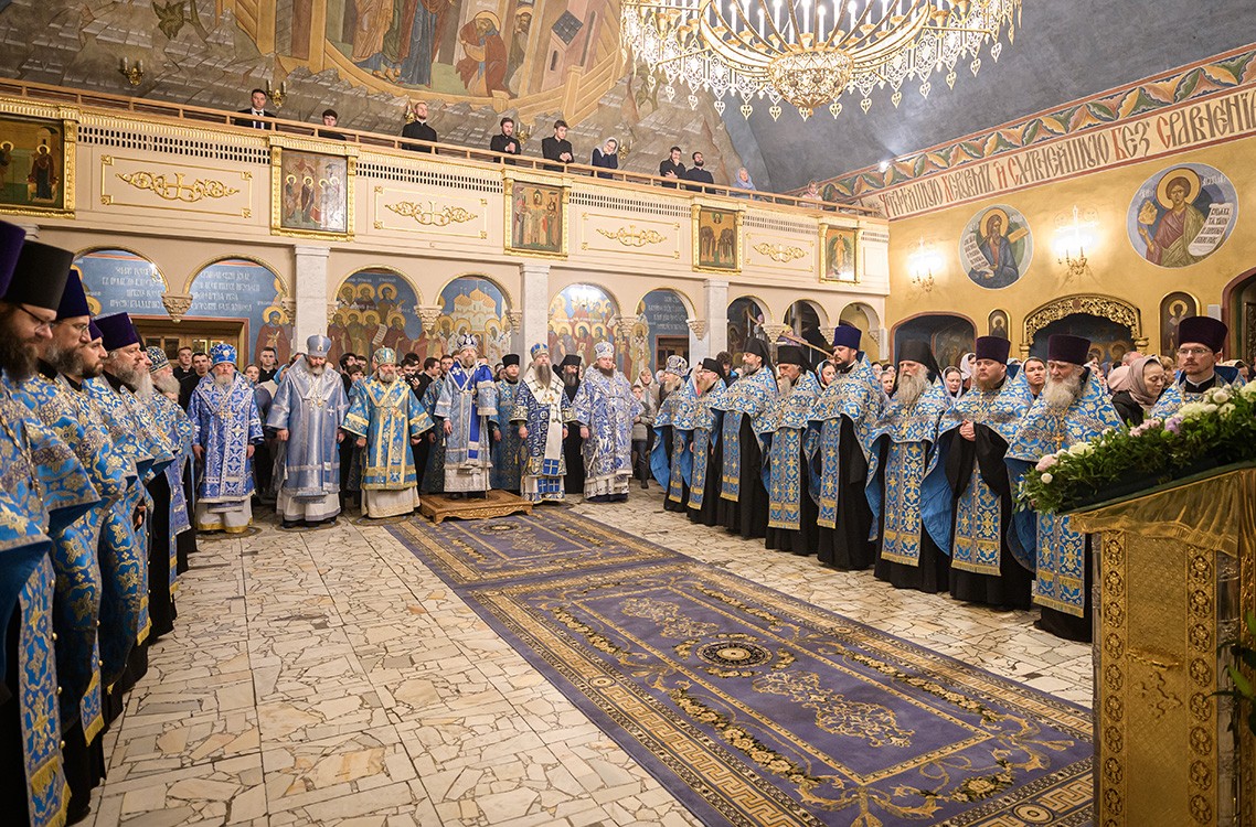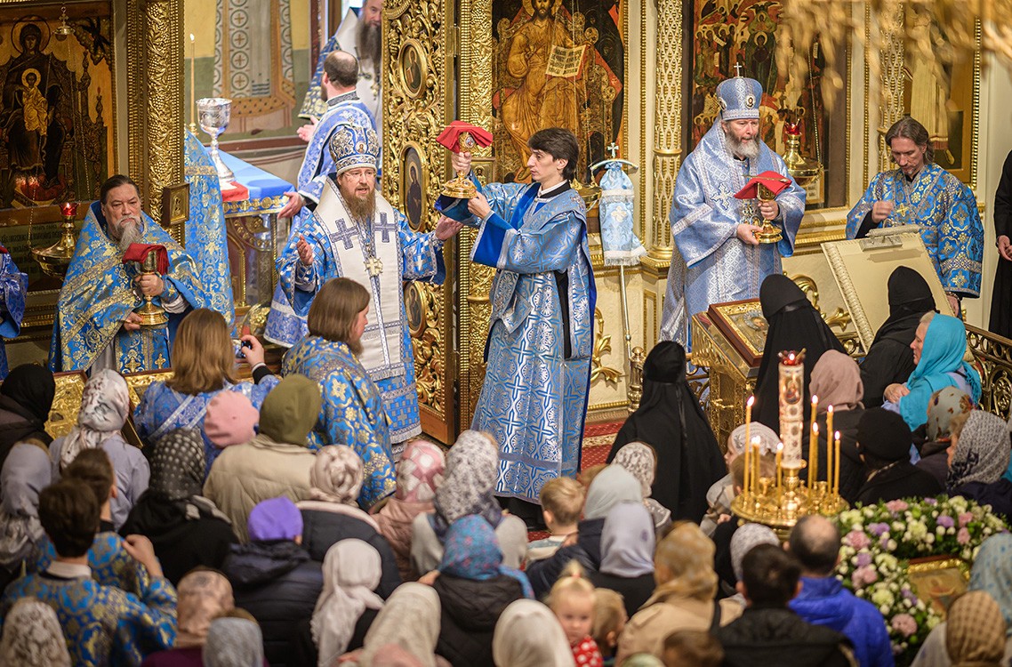 В завершение богослужения архиереи и духовенство совершили славление Пресвятой Богородицы у праздничного образа и вознесли молитву «Царице моя Преблагая».