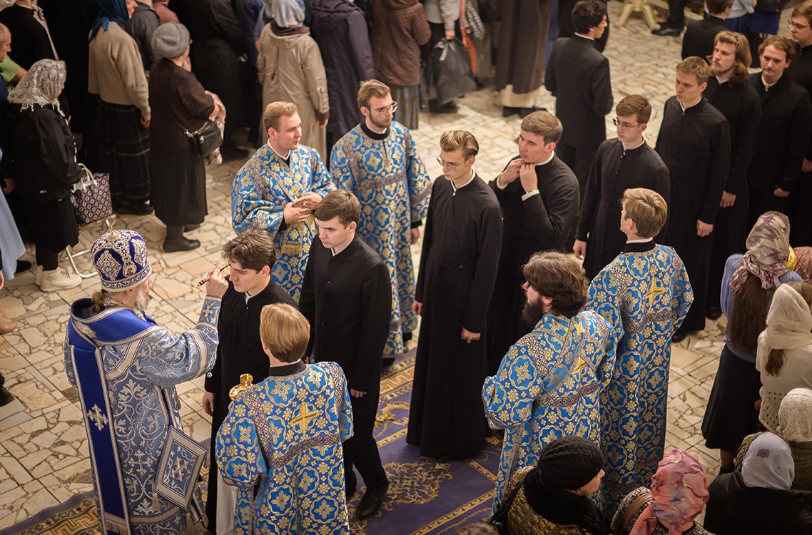 Божественную литургию возглавил Патриарший наместник Московской митрополии митрополит Крутицкий и Коломенский Павел. Ему сослужили митрополит Тверской и Кашинский Амвросий, митрополит Воронежский и Лискинский Леонтий, епископ Скопинский и Шацкий Питирим, викарий Тульской епархии епископ Веневский Феодорит, ректор Санкт-Петербургской духовной академии епископ Петергофский Силуан, ректор Московской духовной академии епископ Сергиево-Посадский и Дмитровский Кирилл, викарий Патриаршего экзархата Африки епископ Луховицкий Евфимий, ректор Хабаровской духовной семинарии, викарий Хабаровской епархии епископ Бикинский Пантелеимон, председатель Учебного комитета Русской Православной Церкви, ректор Общецерковной аспирантуры и докторантуры имени святых равноапостольных Кирилла и Мефодия протоиерей Максим Козлов, почетный ректор Перервинской духовной семинарии протоиерей Владимир Чувикин, ректор Николо-Угрешской духовной семинарии иеромонах Лука (Пронских), проректор по воспитательной работе Сретенской духовной академии иеромонах Зосима (Мельник), старший помощник проректора по воспитательной работе Сретенской духовной академии иерей Серафим Алпатов, заведующий библиотекой Минской духовной академии иерей Александр Волков, духовенство МДА и гости в священном сане.