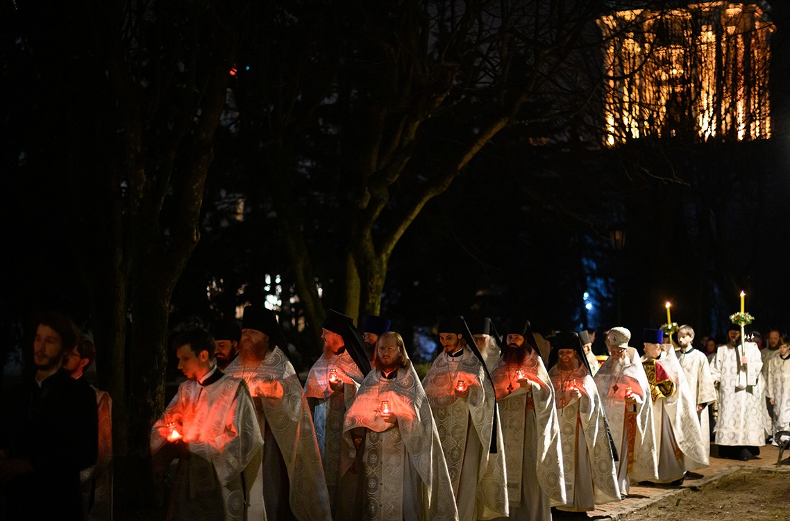 В полночь вся академическая община устремилась на крестный ход. Под звон лаврских колоколов, возвещающих о пасхальной радости, молящиеся шли крестным ходом вокруг храма и воспевали Спасителю трогательную стихиру «Воскресение Твое, Христе Спасе».