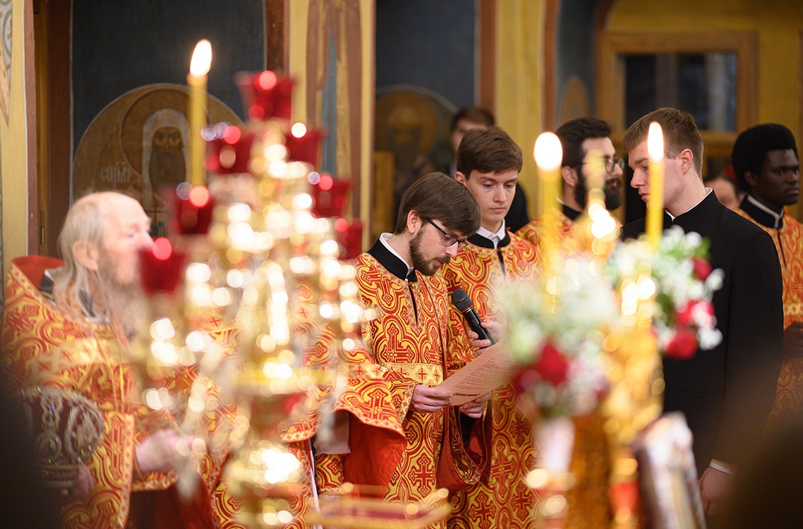 Торжественное богослужение — пасхальную заутреню и Литургию святителя Иоанна Златоуста — в Покровском академическом храме возглавил архимандрит Венедикт (Князев). Ему сослужило академическое духовенство.