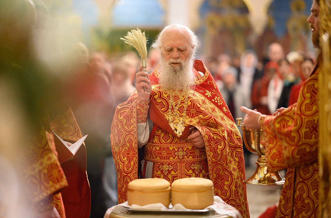 По заамвонной молитве архимандрит Венедикт вознес молитву Господу об освящении артоса и благословении пасхальных снедей.