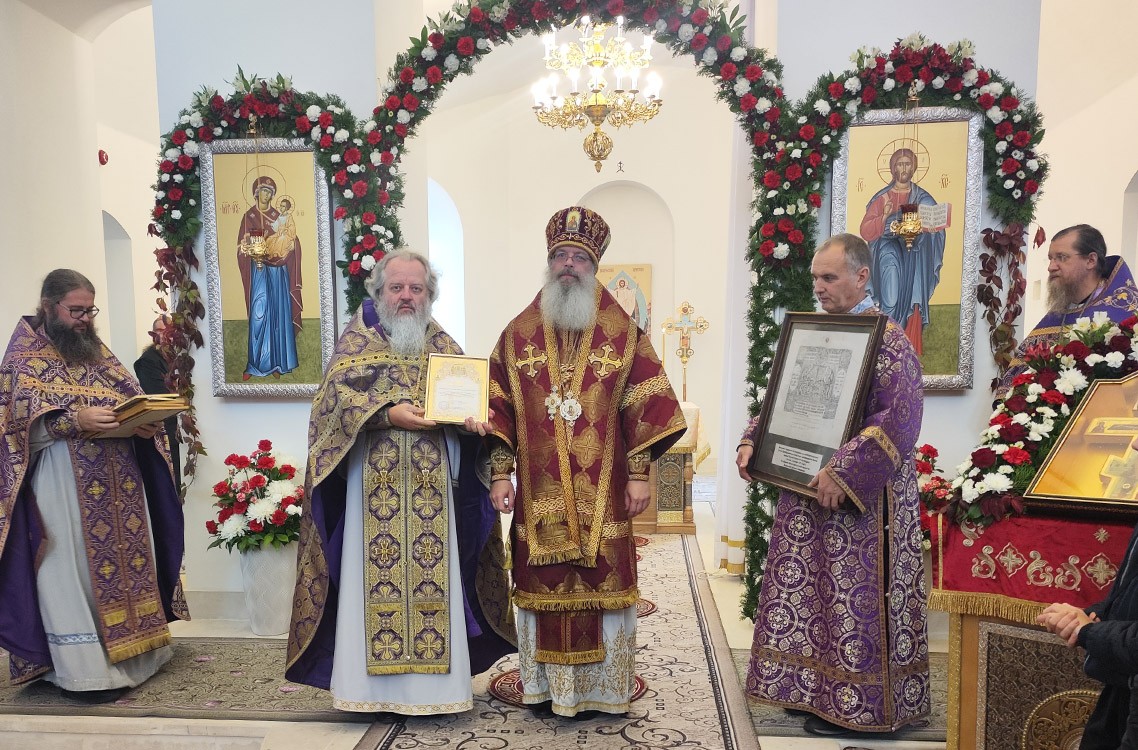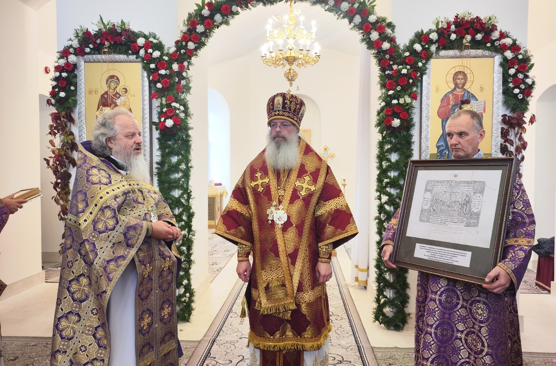 В поздравительном слове владыка Серафим отметил, что нынешний год является для обители особым, поскольку в нем совпали 500-летие Спасо-Преображенского мужского и 400-летие Крестовоздвиженского женского монастырей. За значительный личный вклад в дело возрождения Белевского Спасо-Преображенского монастыря глава епархии наградил игумена Герасима (Дьячкова) благословенной архиерейской грамотой. В подарок мужской обители отец Герасим передал копию антиминса с надписью об освящении настоятелем Белевского Спасо-Преображенского монастыря архимандритом Иовом церкви Покрова Пресвятой Богородицы г. Белева 2 октября 1672 г., который хранится в собрании музея христианского искусства «Церковно-археологический кабинет» Московской духовной академии.