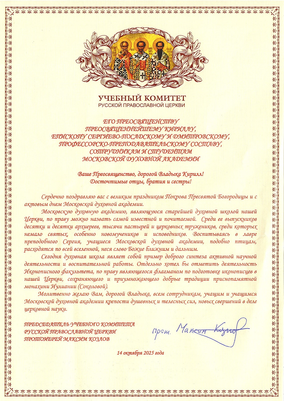 Председатель Учебного комитета Русской Православной Церкви, ректор Общецерковной аспирантуры и докторантуры имени святых равноапостольных Кирилла и Мефодия протоиерей Максим Козлов поздравил Академию с престольным праздником и актовым днем.