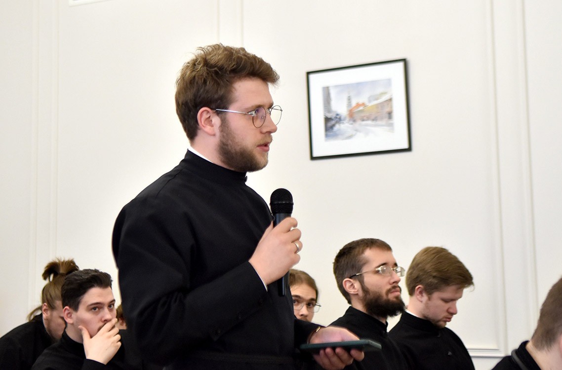 В рамках дискуссии выступили доцент кафедры гражданского процесса юридического факультета СПбГУ кандидат юридических наук А.А. Ференс-Сороцкий на тему «Принципы канонического права» и старший преподаватель кафедры общей и русской церковной истории и канонического права ПСТГУ кандидат теологии А.В. Дружинин на тему «Коллизии церковного и государственного права: механизмы разрешения».