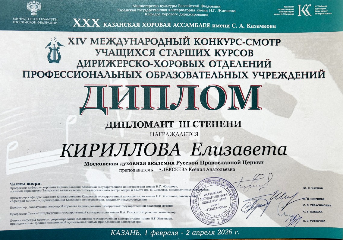 Студентка IV курса факультета церковно-певческого искусства Московской духовной академии Кириллова Елизавета приняла участие в XIV Международном конкурсе-смотре учащихся старших курсов дирижерско-хоровых отделений профессиональных образовательных учреждений, который проходил с 2 февраля по 2 апреля 2026 года в г. Казани на базе Казанской государственной консерватории имени Н.Г. Жиганова, и получила диплом III степени.