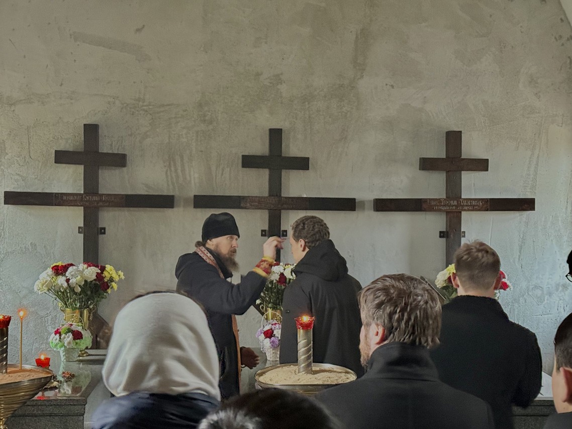 В Воскресенской часовне пустыни преподаватель МДА иеромонах Филарет (Зубов) совершил заупокойную литию по убиенным в пасхальную ночь 1993 года иеромонаху Василию, инокам Трофиму и Ферапонту, а также схиархимандриту Илию (Ноздрину) и иеродиакону Илиодору (Гайриянцу).