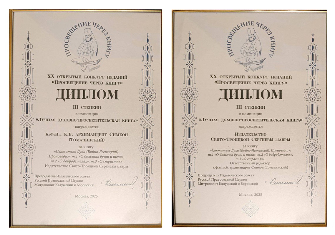 В номинации «Лучшая духовно-просветительская книга» были отмечены три тома избранных проповедей святителя Луки: «О болезнях души и тела», «О добродетелях», «О страстях»; ответственный редактор и автор предисловия: кандидат филологических наук, кандидат богословия, доцент МДА архимандрит Симеон (Томачинский); составление и подготовка текста: преподаватель МДА Константин Малакаев. Это издание стало совместным проектом Московской духовной академии и Свято-Троицкой Лавры и, где уже много лет ведется научное изучение трудов святителя Луки.