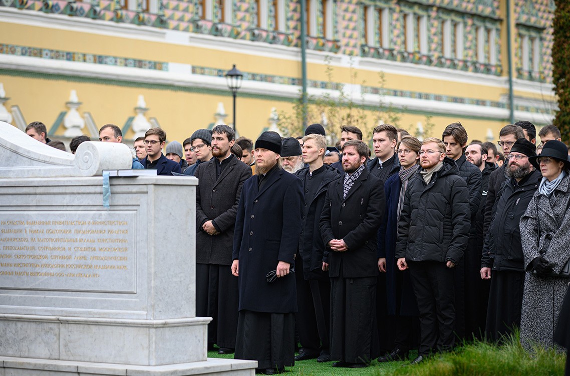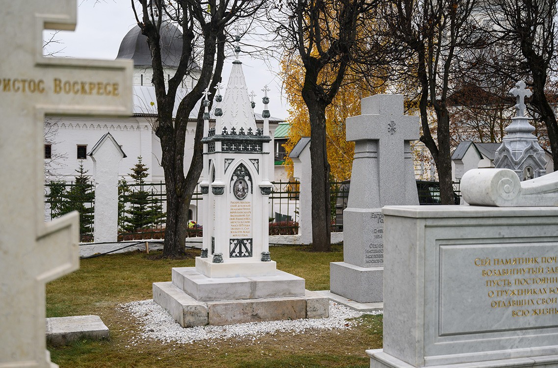 Сегодня мы собрались у замечательного памятника протоиерею Александру Горскому. Его воссоздание — последняя точка в большой работе ряда специалистов, среди которых историки, археологи, антропологи, реставраторы, дизайнеры и многие другие люди, внесшие свою лепту в восстановление всего академического некрополя и его прекрасных исторических памятников. Сегодня в этой многолетней работе ставится большая точка. Мы не закрываем книгу “некрополь Московской духовной академии”, но перелистываем очень значимую ее страницу — она уходит в историю. Из всех воссозданных в наше время памятников, о которых мы имеем представление по сохранившейся дореволюционной фотографии, этот памятник последний. Больше у нас нет сведений, как выглядели, например, памятники у профессора П.С. Казанского, который также погребен здесь, и других преподавателей, монахов и студентов Академии.