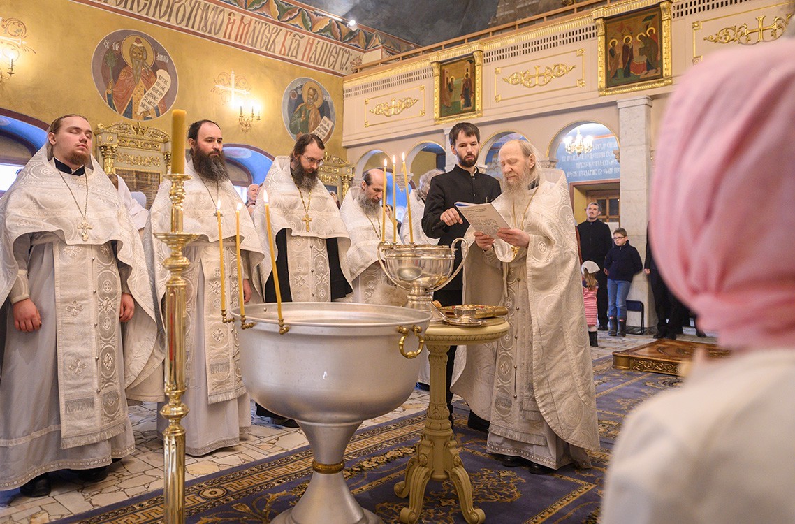 После Литургии духовенство совершило Великую вечерню праздника Крещения Господня с чином Великого освящения воды. Возглавил чин архимандрит Платон (Игумнов). В завершение чина священнослужители окропили Великой агиасмой храм и молящихся.