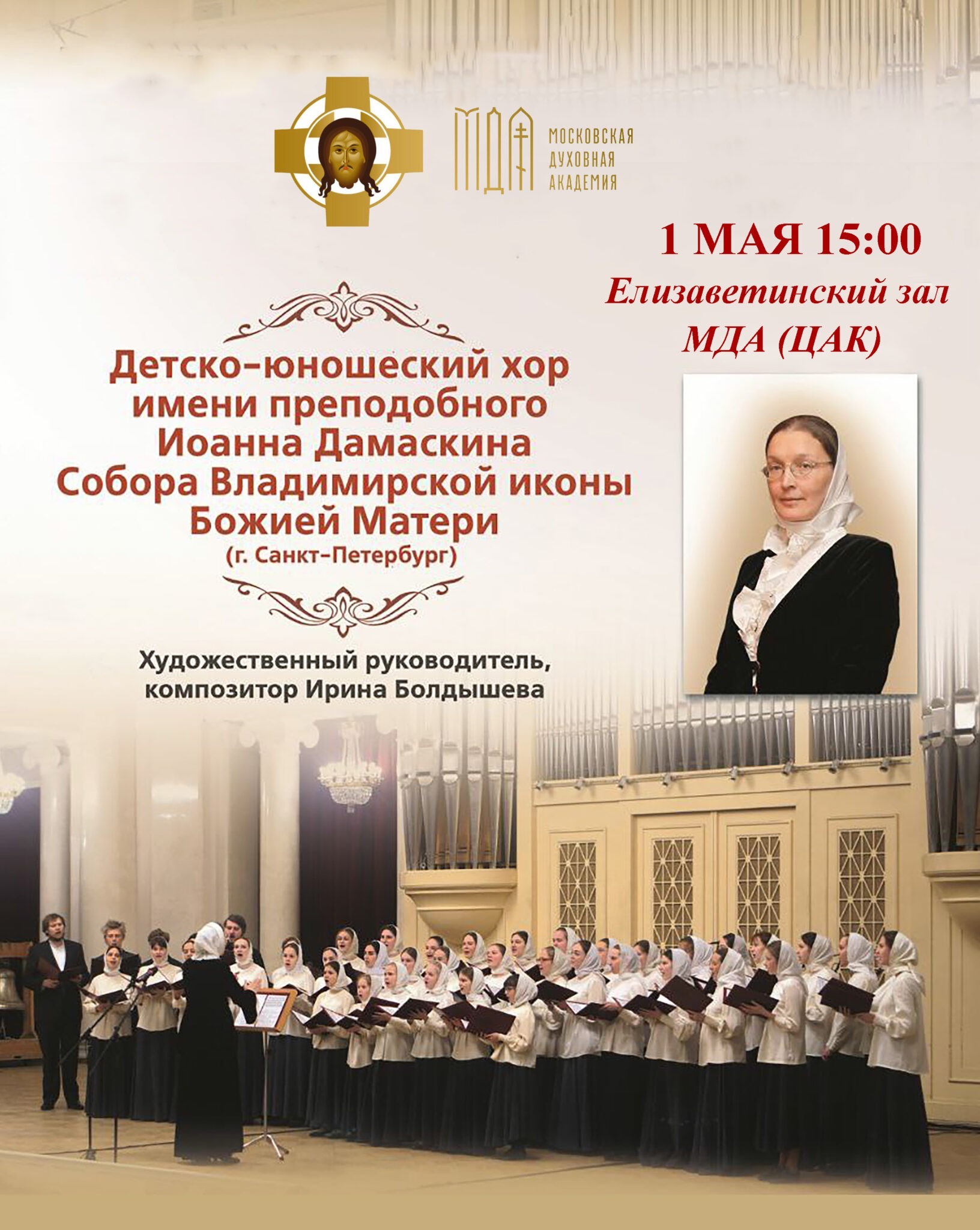 1 мая в 15:00 в Елизаветинском зале Московской духовной академии состоится концерт детско-юношеского и молодежного хора собора Владимирской иконы Божией Матери г. Санкт-Петербурга под управлением Ирины Болдышевой.
