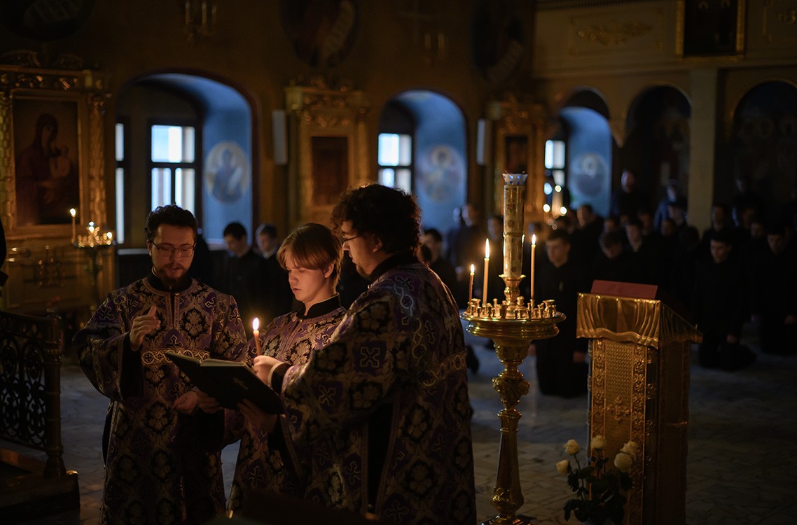 Утром 9 марта в Покровском храме Московской духовной академии академическая община собралась за Литургией Преждеосвященных Даров. Возглавил богослужение иеромонах Феодор (Юлаев) в сослужении преподавателей и студентов в священном сане.