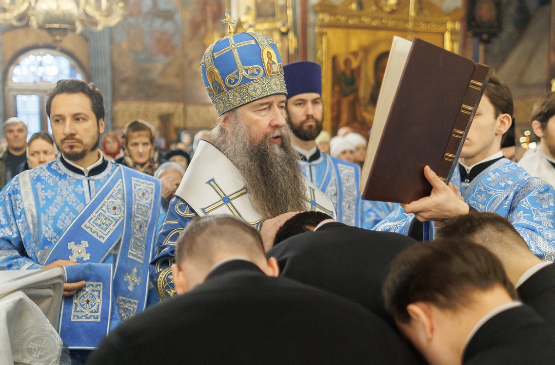 За богослужением владыка совершил диаконскую хиротонию студента 4 курса бакалавриата Академии Дионисия Афонина и хиротесию во чтецов студентов 4 курса бакалавриата МДА Максима Сахарова, Николая Смирнова, Дмитрия Пугача и Владимира Степанова.
